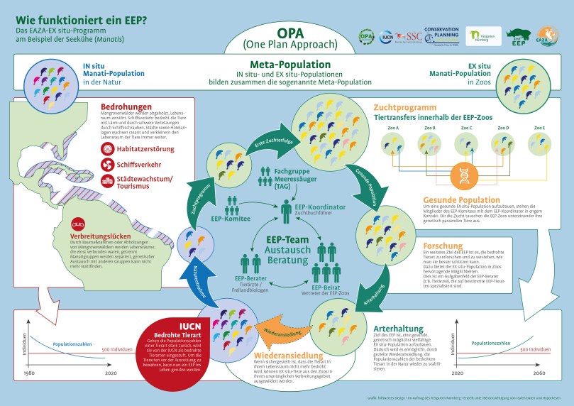 Alle in der EAZA organisierten Zoos müssen ihren Beitrag zum Programm leisten. Zuchtbücher für einzelne Populationen werden von einem Koordinator, der üblicherweise Spezialist für die von ihm betreute Tierart sein soll, geführt. Die erforderlichen Daten hierzu erhält er u.a. aus dem Zoologischen-Informations-Management-System (ZIMS) in das die Zoos weltweit die Daten ihrer Tiere eingeben. Allerdings sind Daten alleine nutzlos. Daher gehört die weltweite Kommunikation mit den Zoo-Kuratoren (verantwortlich für den Tierbestand in den Zoos) und anderen Instutitionen und Wissenschaftlern zu seinen wichtigsten Aufgaben. Keine leichte Aufgabe. One Plan Approach Programme (OPA) gelten der Erhaltung besonders bedrohter Tierarten. Hierbei werden freilebende und in Zoos gehaltene Tiere als eine Population behandelt und bei Bedarf ausgetauscht. (siehe Grafik am Ende) So wird sichergestellt, dass die Populationen physisch und genetisch gesund bleiben und auch für die Wiederauswilderung zur Verfügung stehen, sofern das möglich ist. Für die Jahre 2018/19 wurde die Zahl der wieder angesiedelten Tiere mit 3070 in 46 Arten angegeben.