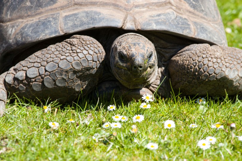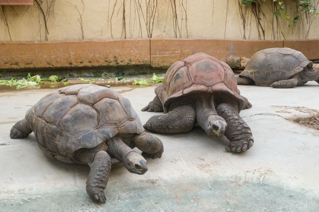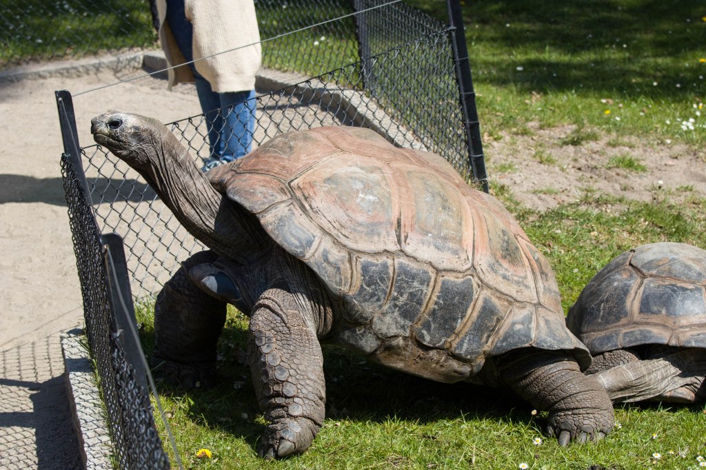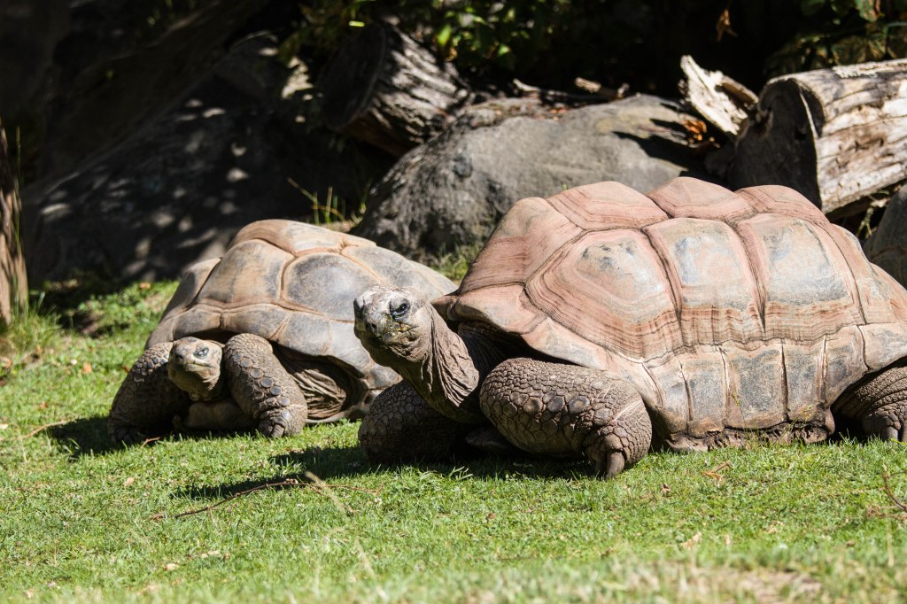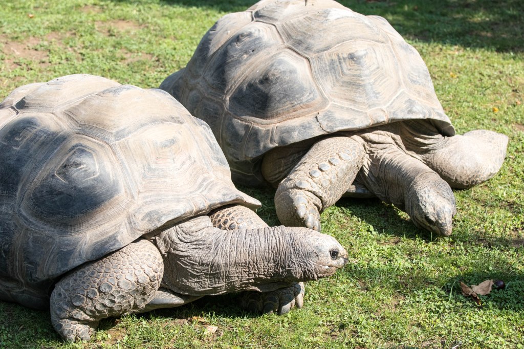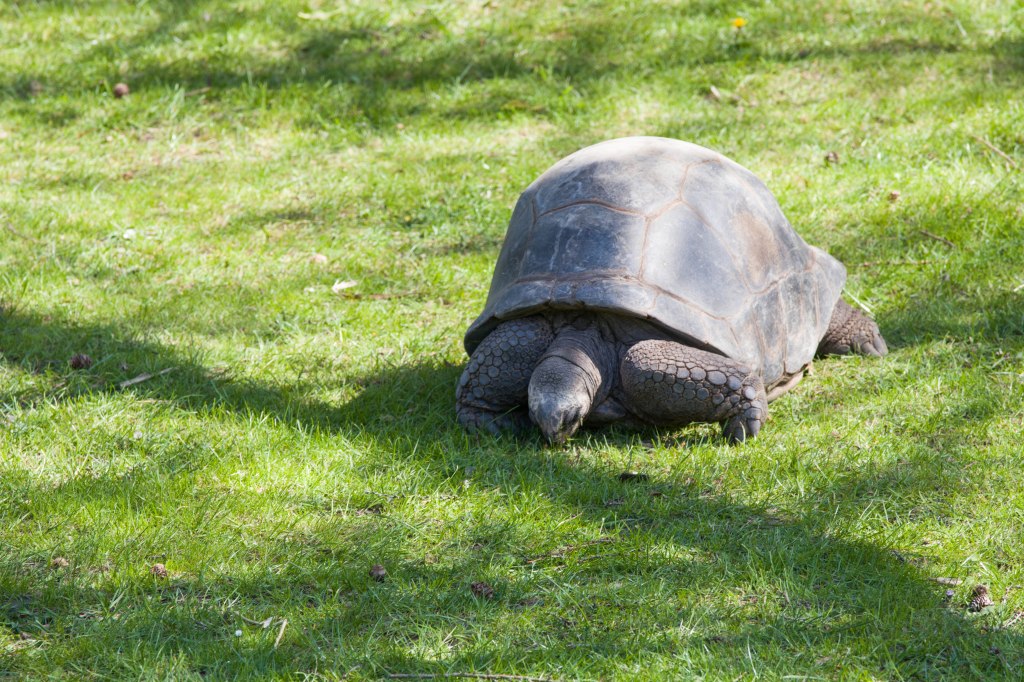 Es sind wahrhaftig urtümliche Tiere. Seit etwa 60 Millionen Jahren (dem Tertiär) bevölkern sie diesen Planeten – unvorstellbar. Geduldig und bedächtig in ihren Bewegungen, in Eile höchstens, wenn Futter in der Nähe gewittert wird oder ein paarungsbereites Weibchen das Interesse eines Männchens geweckt hat. Ich spreche von Landschildkröten (Familie: Testudinidae) und zwar von den Schwergewichtigen unter Ihnen, den Galapagos-, Aldabra- (oder Seychellen-) Riesenschildkröten und Spornschildkröten. Schildkröten sind Reptilien und haben mit Kröten, die ja Amphibien sind, nichts zu tun. Der irreführende Name wurde jedoch bereits im Altgriechischen verwendet, χελώνη bzw. Cheloni bedeutet u.a. „Schildkröte“. Übrigens wurde die in der Ära Gaius Julius Caesars entwickelte militärische Angriffsformation des römischen Heeres „Testudo“ oder „Schildkrötenformation“ genannt. Asterix Leser kennen das natürlich.