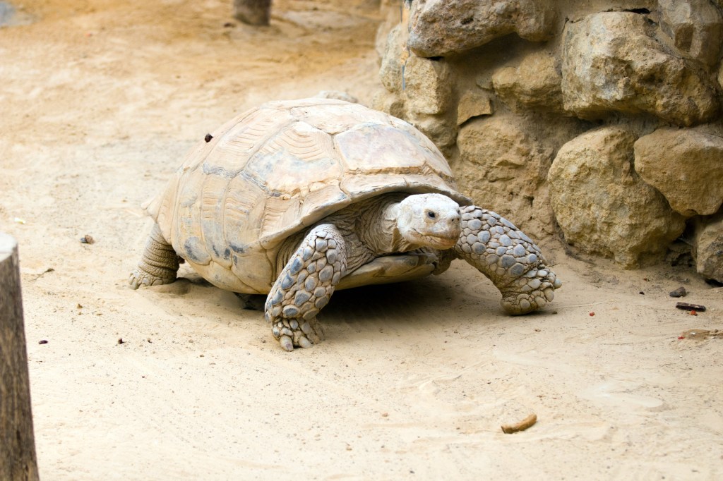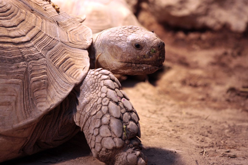 Eigentlich gehört diese Schildkrötenart nicht zu den Riesenschildkröten. Sie sind auch nicht mit einander verwandt. Allerdings wachsen auch sie zu beeindruckender Größe heran, sodass ich ihnen gerne einen Platz im Beitrag einräume. Den Namen erhielten sie von einem Sporn am Hinterbein. Der Lebensraum der Spornschildkröte ist die Sahelzone. Diese zieht sich bekanntermaßen vom Atlantik in einem schmalen Streifen bis zum Roten Meer. Es ist ein an sich schon schwieriger Lebensraum der von seinen Bewohnern hohe Anpassung verlangt. Das durch den Klimawandel verursachte Ausbreiten der Sahara nach Süden gefährdet den Lebensraum jedoch extrem.