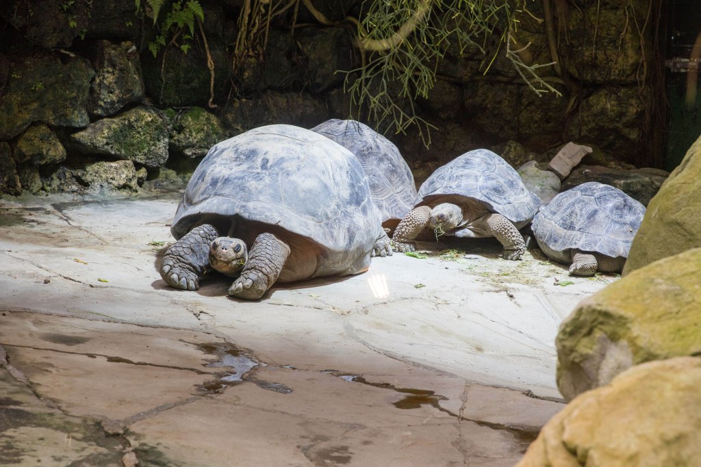 Es sind wahrhaftig urtümliche Tiere. Seit etwa 60 Millionen Jahren (dem Tertiär) bevölkern sie diesen Planeten – unvorstellbar. Geduldig und bedächtig in ihren Bewegungen, in Eile höchstens, wenn Futter in der Nähe gewittert wird oder ein paarungsbereites Weibchen das Interesse eines Männchens geweckt hat. Ich spreche von Landschildkröten (Familie: Testudinidae) und zwar von den Schwergewichtigen unter Ihnen, den Galapagos-, Aldabra- (oder Seychellen-) Riesenschildkröten und Spornschildkröten. Schildkröten sind Reptilien und haben mit Kröten, die ja Amphibien sind, nichts zu tun. Der irreführende Name wurde jedoch bereits im Altgriechischen verwendet, χελώνη bzw. Cheloni bedeutet u.a. „Schildkröte“. Übrigens wurde die in der Ära Gaius Julius Caesars entwickelte militärische Angriffsformation des römischen Heeres „Testudo“ oder „Schildkrötenformation“ genannt. Asterix Leser kennen das natürlich.
