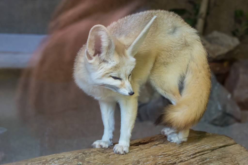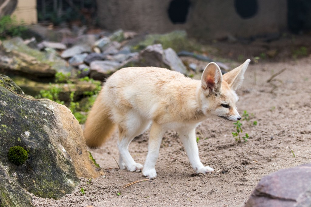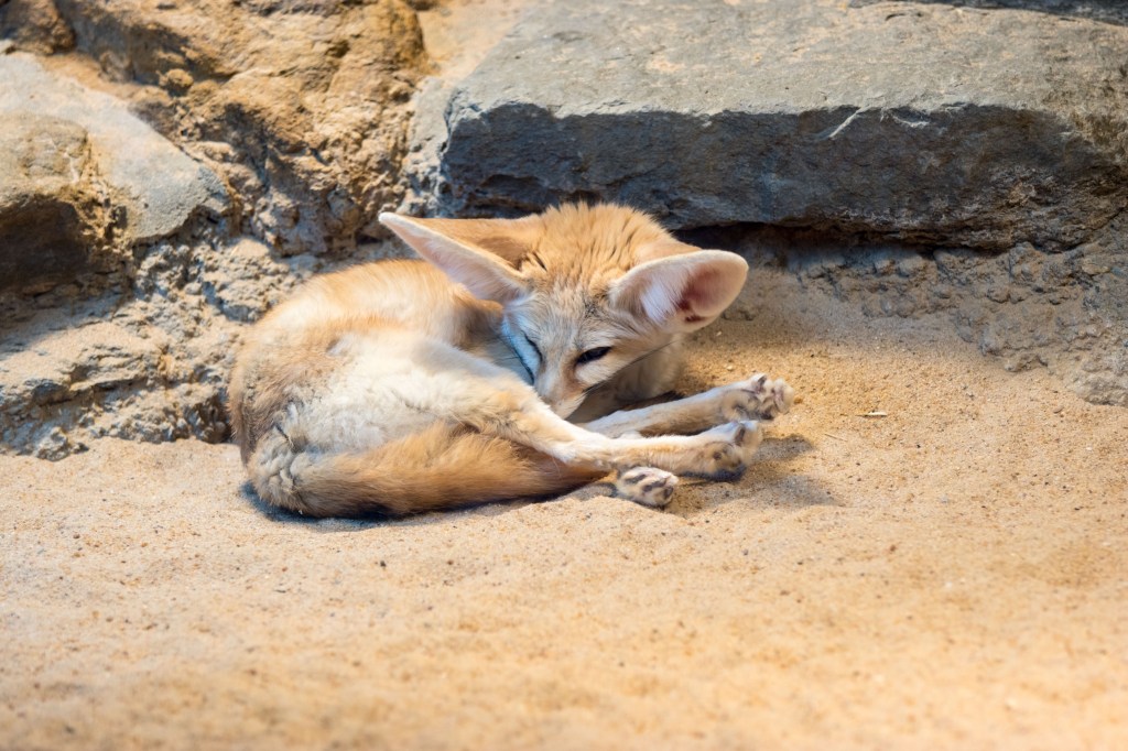 Die sogenannte Allensche Regel besagt, dass Körperanhänge (also z.B. Ohren, Beine, Schwanz) in kälteren Regionen kürzer sind als bei Tieren die in warmen oder heißen Regionen leben. Fenneks mit ihren langen Beinen und riesigen Ohren sind ein sehr gutes Beispiel für die perfekte Anpassung an Klima und Lebensraum. Mit etwa 35 – 40 cm Körperlänge und einem Gewicht von 1,5 kg gehören sie zu den kleinsten Vertretern der Fuchsfamilie. Ihre Ohren messen etwa 15 – 19 cm in der Länge. Fenneks können damit sehr tiefe Töne wahrnehmen und somit Bewegungen tief im Sand lokalisieren. Sie dienen nicht nur zum Aufspüren der Nahrung, sondern auch zum Temperaturausgleich, da sie nicht schwitzen können. Das dichte, weiche und lange Fell vermutet man nicht unbedingt bei einem Tier, das in der Wüste lebt. Fenneks sind jedoch dämmerungs- und nachtaktiv und sind so bestens gegen die nächtliche Kälte geschützt.