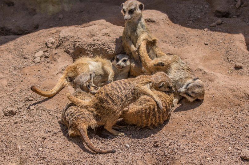 Dabei fällt auf wie viele der Besucher gut informiert sind. Das ausgesprochen spannende Sozialverhalten der Erdmännchen macht die Tiere interessant für den Schulunterricht oder die Zoopädagogik. Übrigens gibt es viele Namen für sie, darunter Scharrtiere (von Prof. Grzimek so genannt wegen ihrer Leidenschaft fürs Graben) oder Meerkat (Meerkatze in Afrikaans). In der Systematik der Biologie gehören Erdmännchen zur Familie der Mangusten.